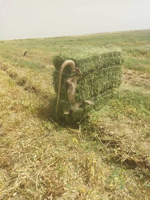 Эта информация не соответствует действительности. На самом деле фотографии, которые рассылают по мессенджерам, сделаны в Кыргызстане, в Джалал-Абадской области. Там фермер действительно нашёл в тюке сена крупного варана — он попал в пресс-подборщик случайно во время сенокоса.